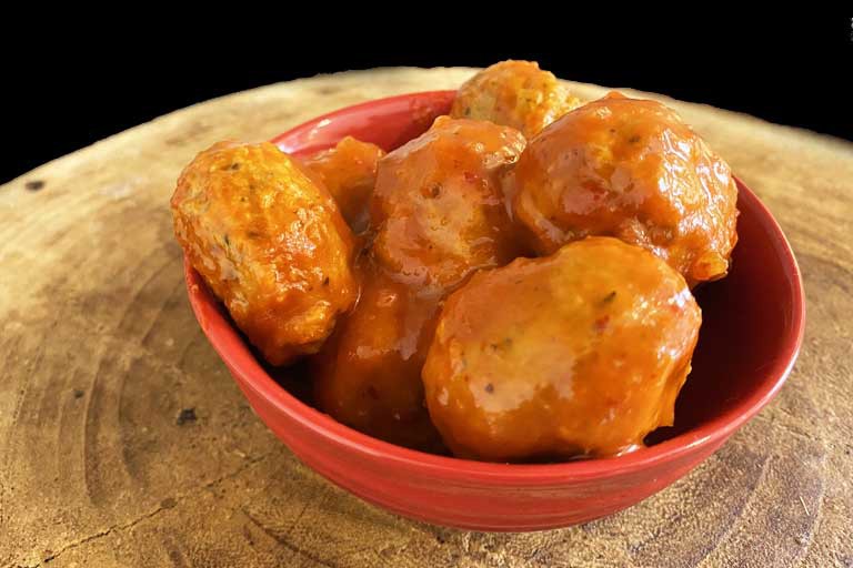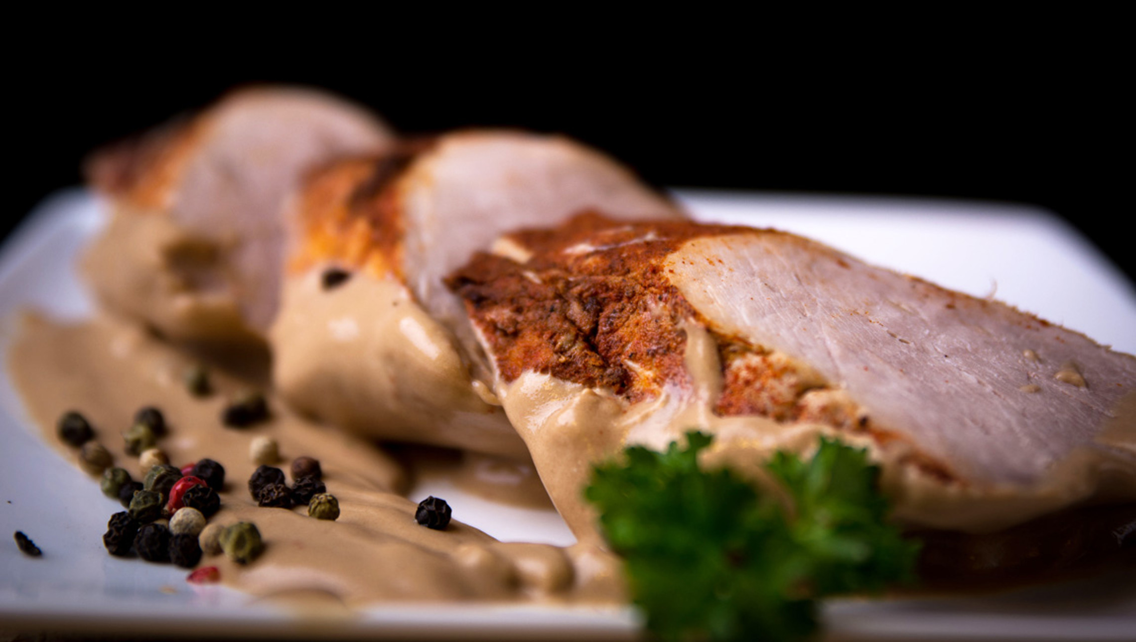 Sappig varkenshaasje, versneden in stevige nootjes, overgoten met een smaakvolle champignonsaus.