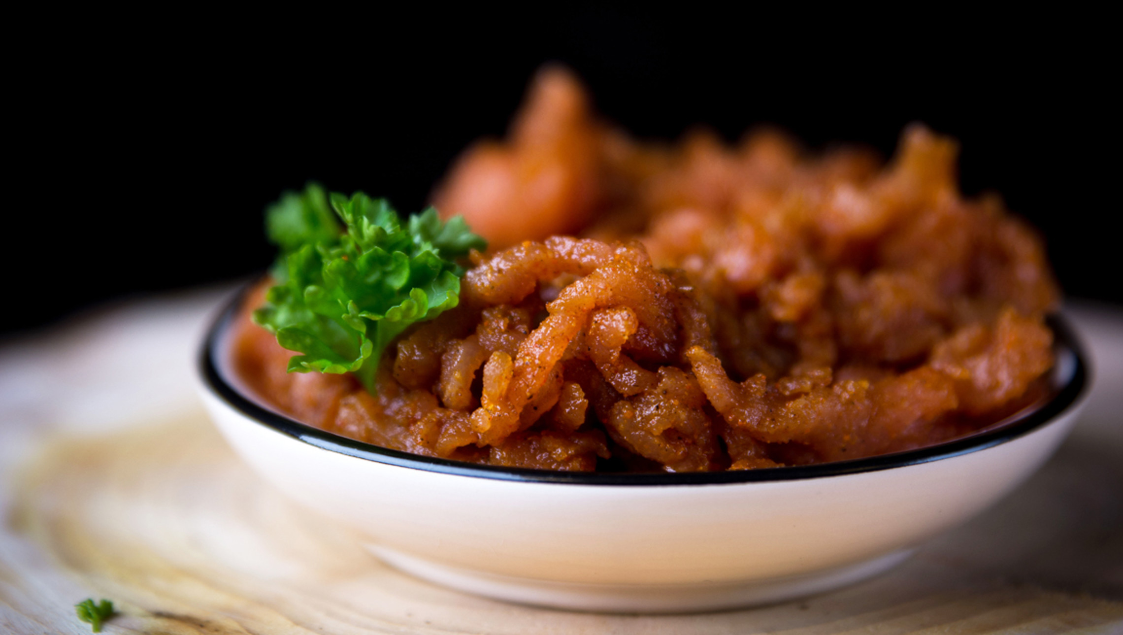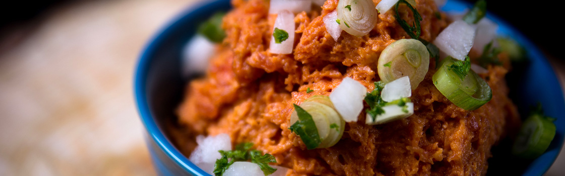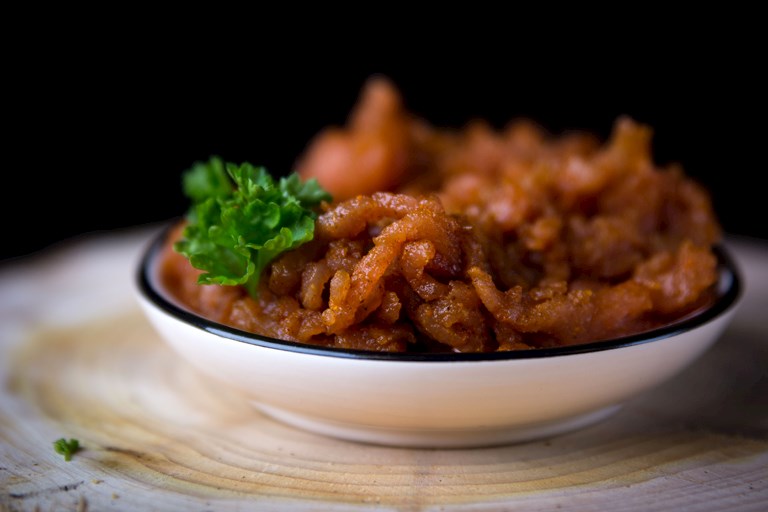Kruidige, fijn gesneden reepjes varkensvlees. Perfect met een looksausje en wat groentjes tussen een pitabroodje!