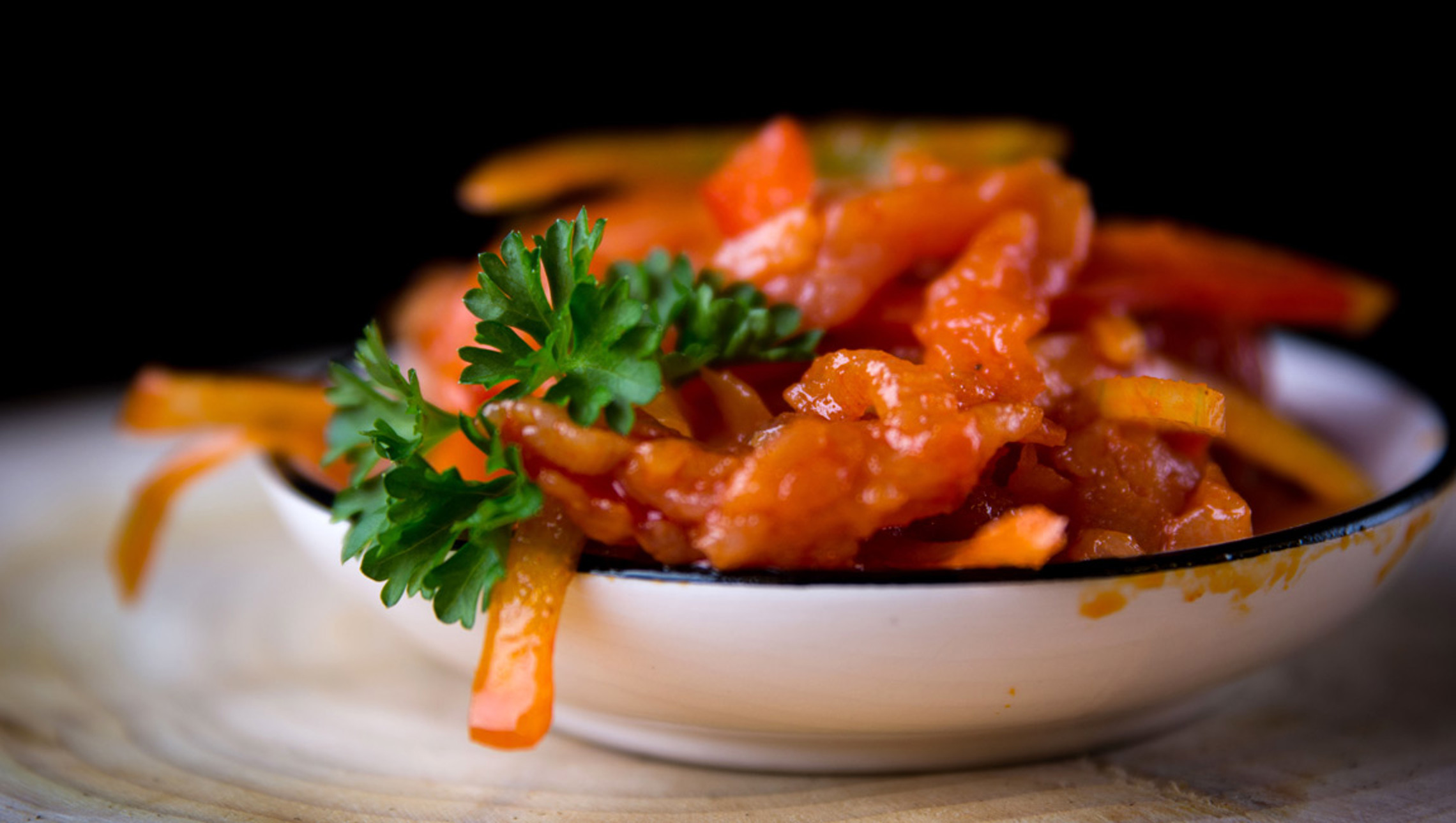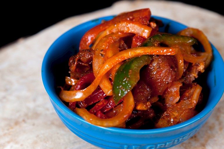 Kruidige reepjes varkensvlees met ajuin en paprikareepjes!