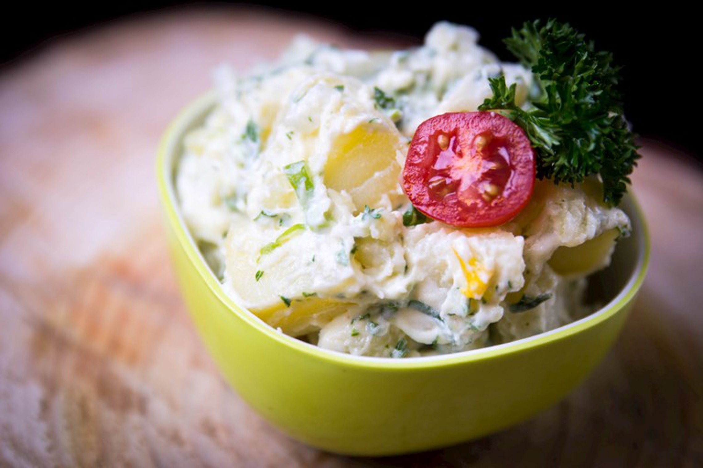 Huisbereide aardappelsla met snipperui, pijpajuintjes en mayonaise. Perfect bijgerecht voor de BBQ, of bij een koud buffetje.