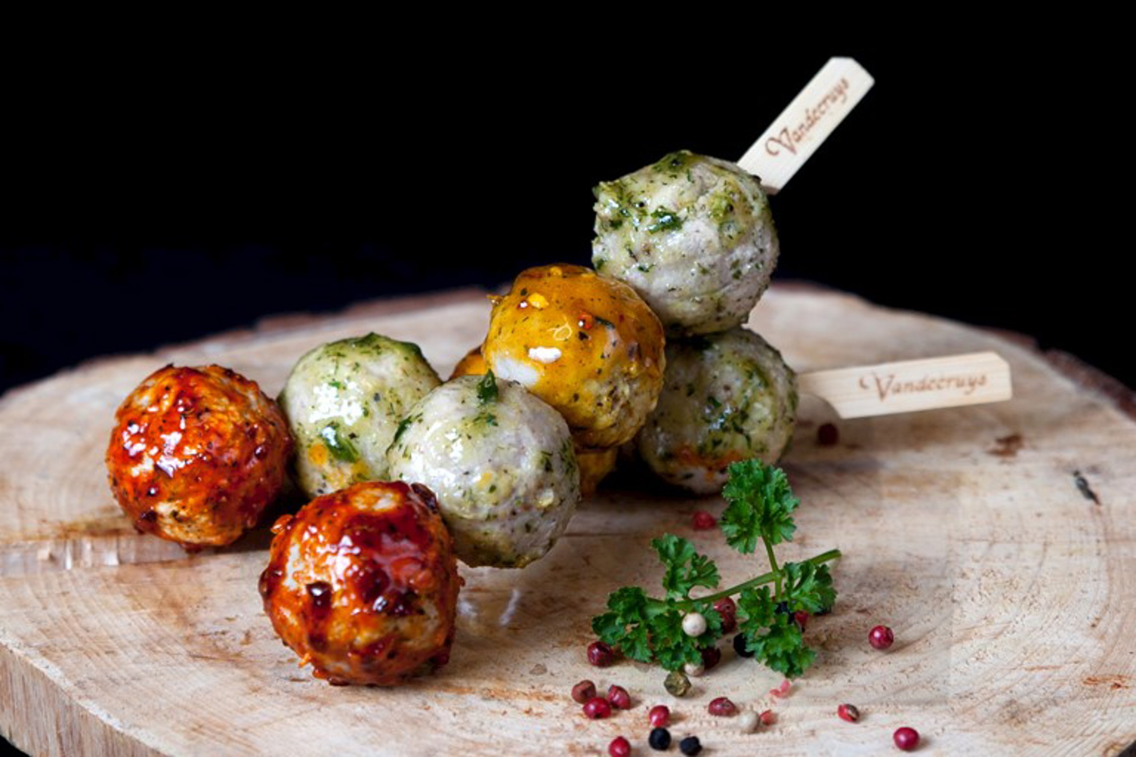 Spiesje van heerlijk huisbereide kippengehaktballetjes gemarineerd in een driekleurenkleedje. Apertieftopper en leuk voor de kids!
