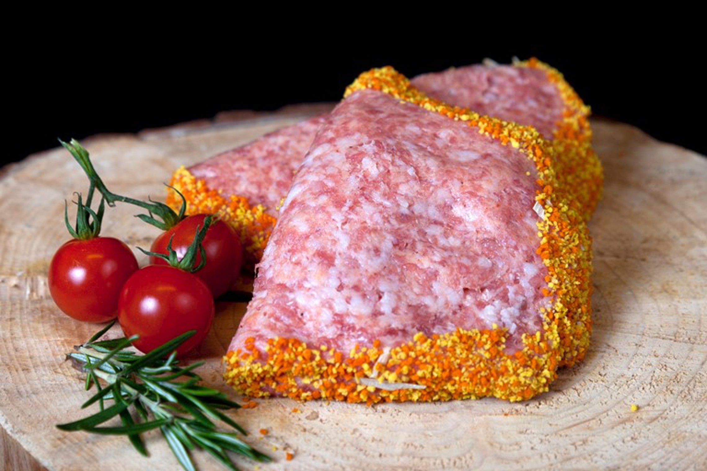 Cordon bleu van gemengd gehakt, gevuld met kaas en parmaham. Afgewerkt met fijne chapelure.