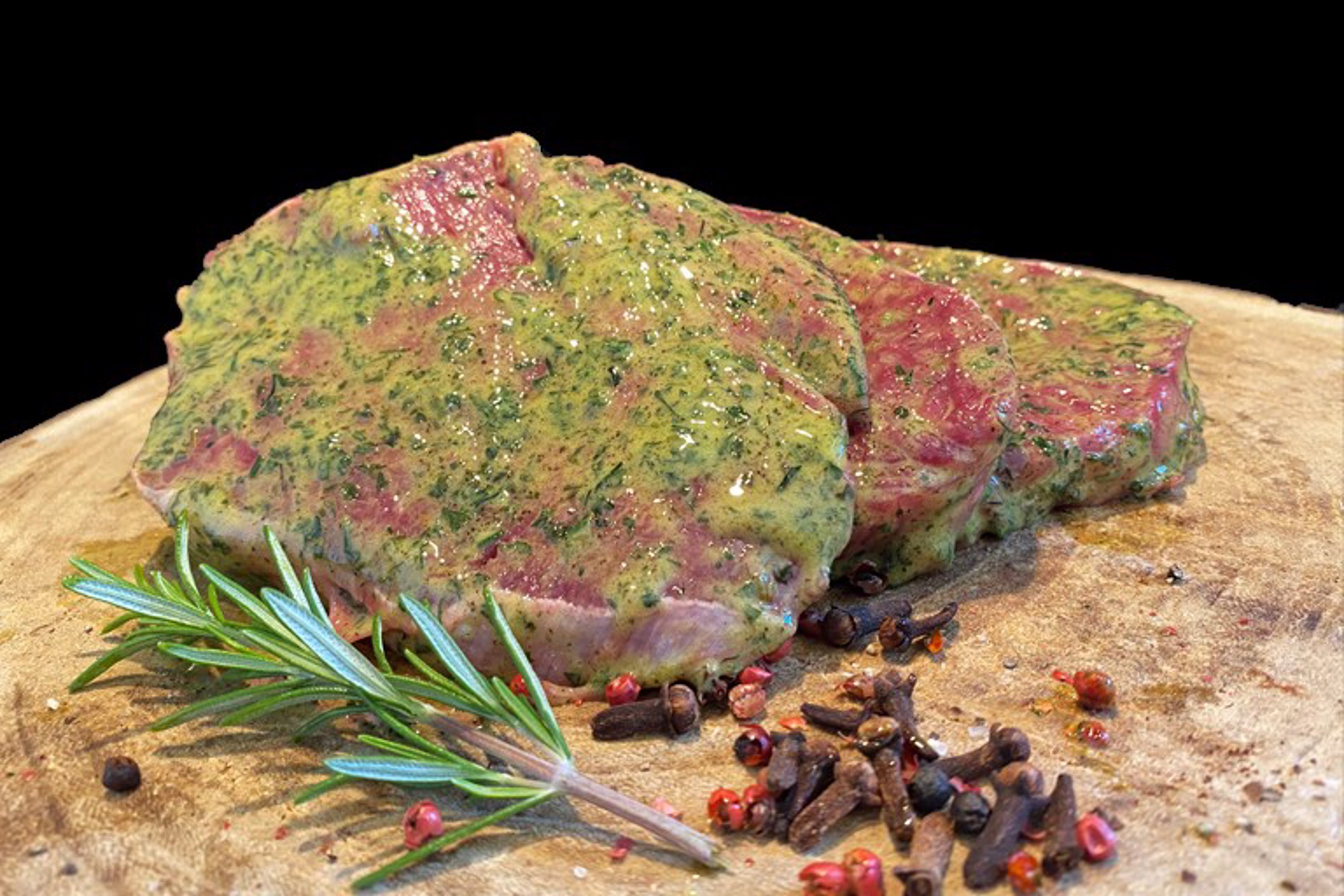Een zeer zacht en mals stukje vlees met een goede dooradering. Afkomstig van de voorkant van de rug van het rund, tussen de schouder en de lende. Duurzaam en gezond met een verrassend intense smaak. Afgewerkt met een aromatische, groene oliemarinade.