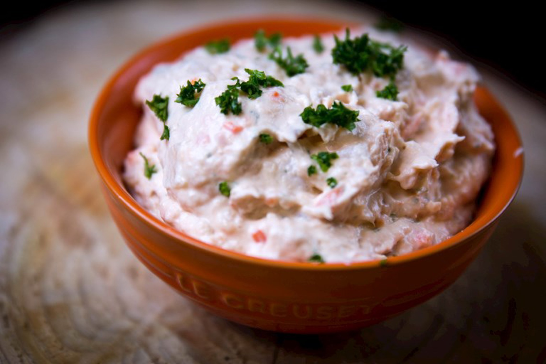 Een echte delicatesse: fijngesneden plakjes gerookte zalm met fijne selder en zilveruitjes in een volle saus.