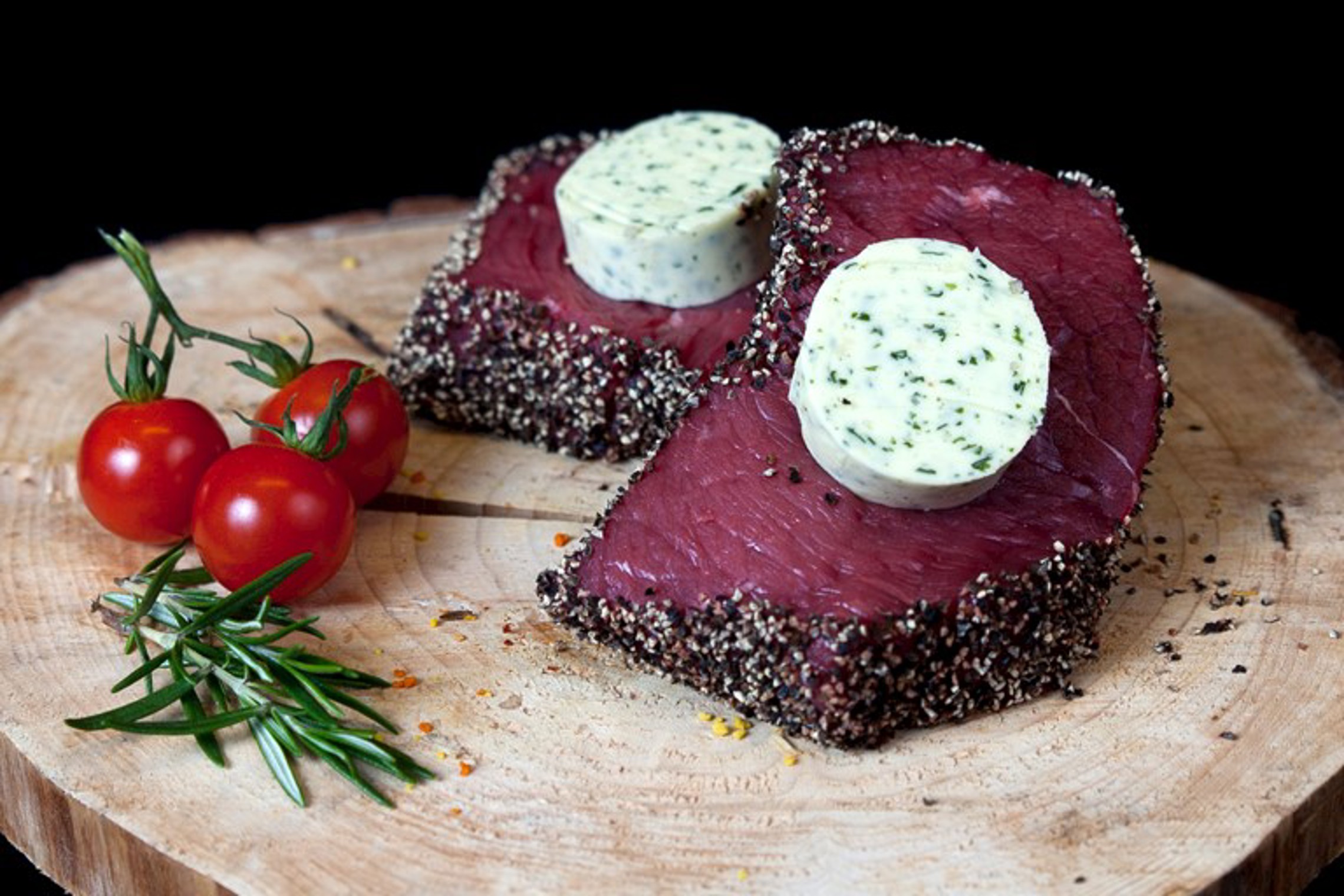 Malse rumsteak van ons Belgisch Witblauw, omwikkeld met fijne zwarte peper en voorzien van een schijfje kruidenboter. Smullen!!