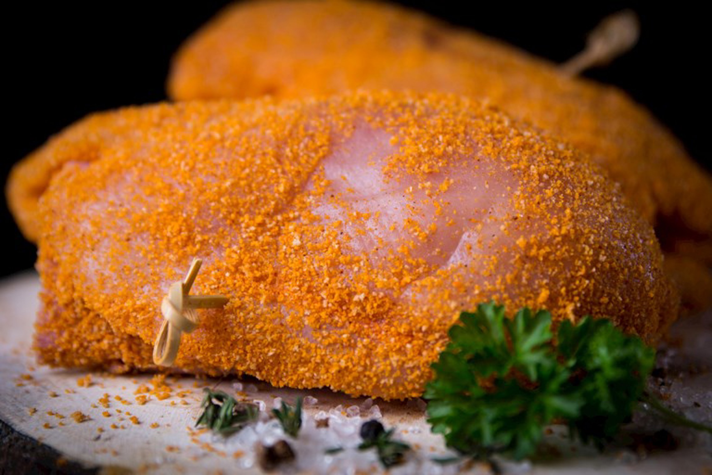 Verse kipfilet opgevuld met kaas en ham, omwikkeld in een jasje van paneermeel.