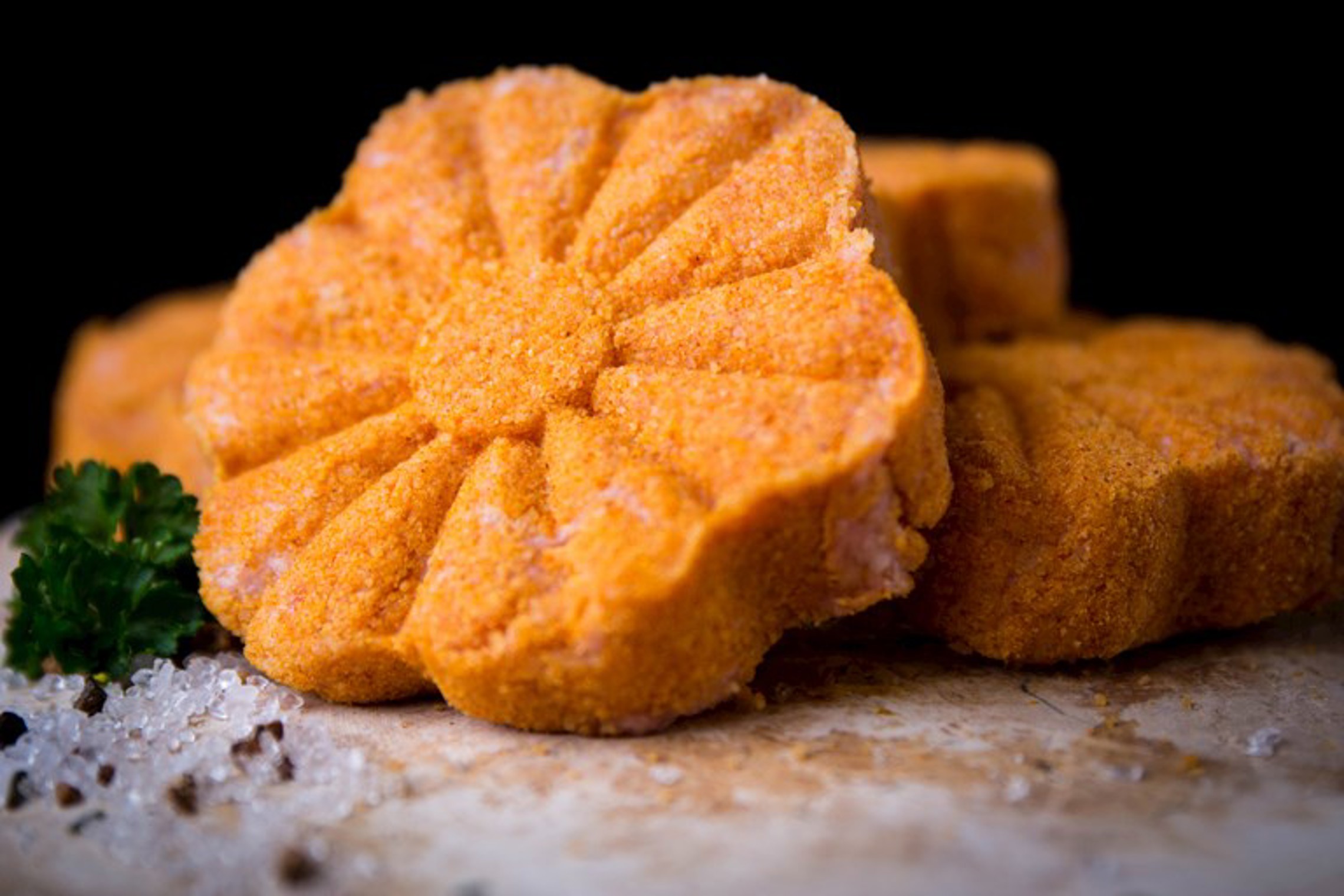 Een hamburger gemaakt van kipgehakt, afgewerkt met een perfect bijhorende paneermeel.