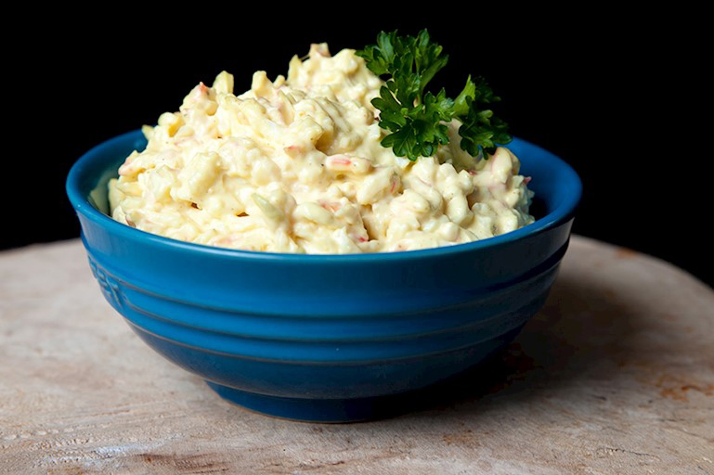 Fris slaatje met versgekookte eitjes, krab, surimi en een romige gele currysaus. Smaakt heerlijk tussen een verse pistolet of op toastjes!