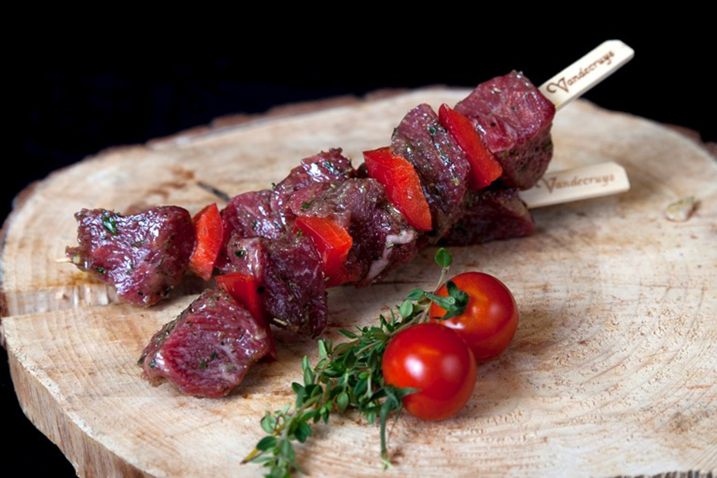 Fijne stukjes lamsvlees afkomstig van zachte lamsbout in een marinade van bieslook, dille, peterselie, dragon en rozemarijn, samen met stukjes rode paprika op een stokje. Perfect voor op de barbecue!