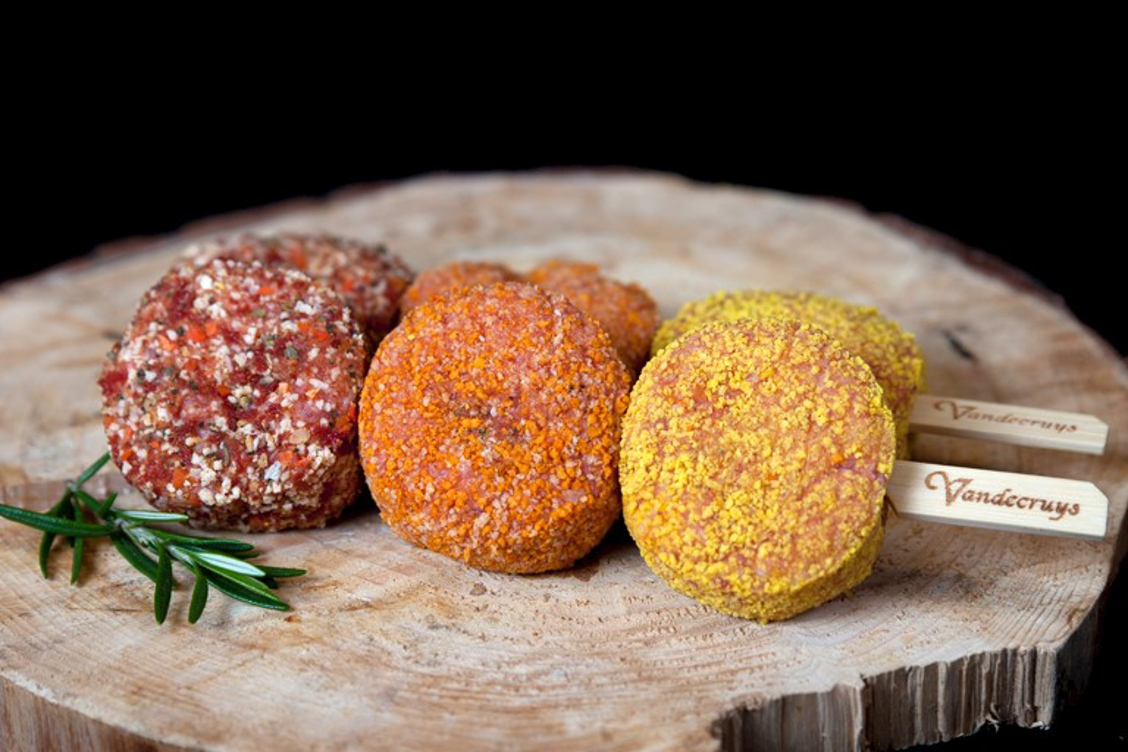 Leuk voor de kids! Een trio van mini hamburgertjes met 3 kleurtjes gepaneerd op een stokje.