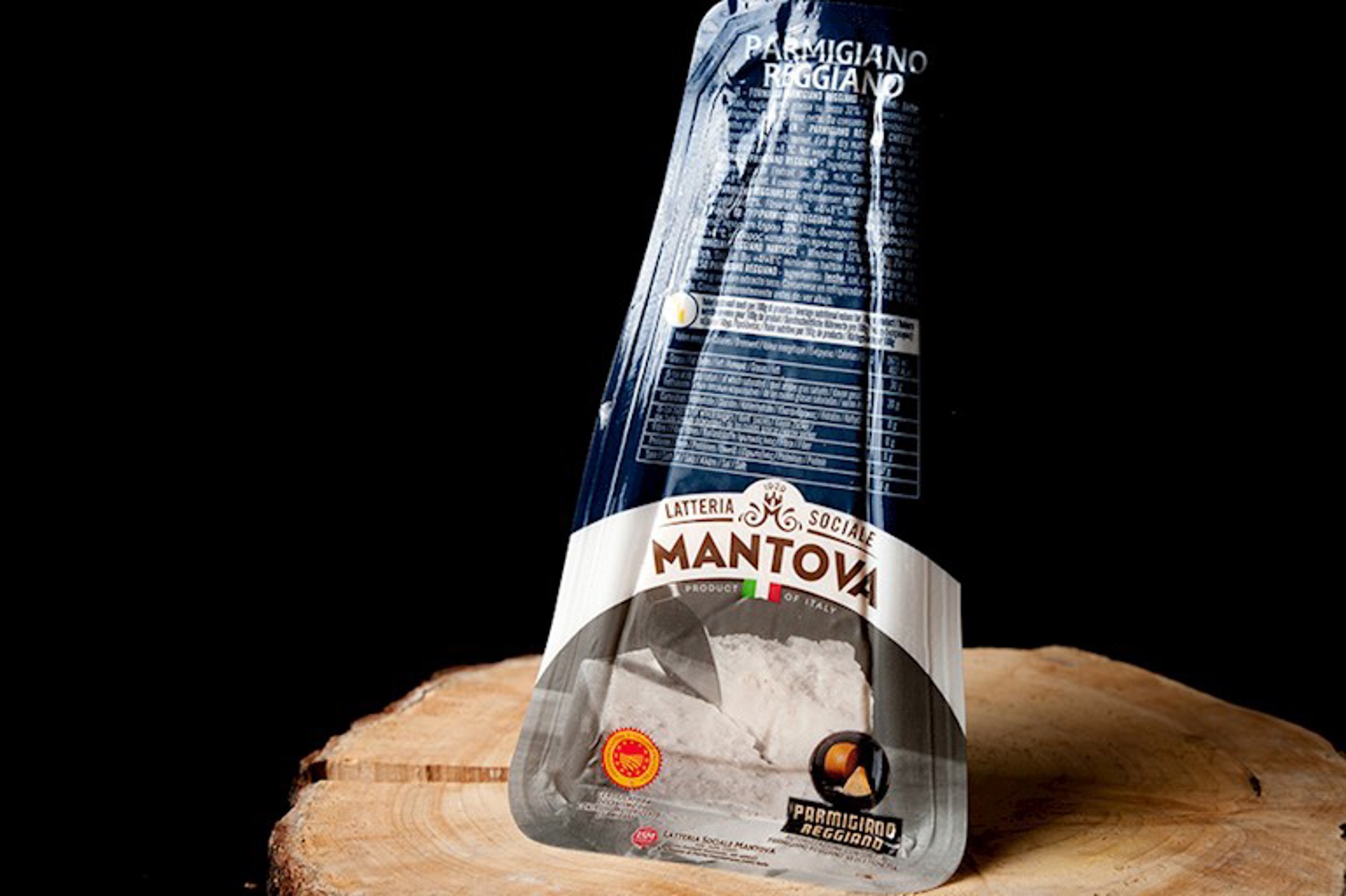 Italiaanse D.O.P. harde kaas gemaakt van rauwe koemelk, half afgeroomd door een natuurlijk crèmeproces, met een rijping langer dan 24 maanden, verpakt met 'darfresh'-technologie.