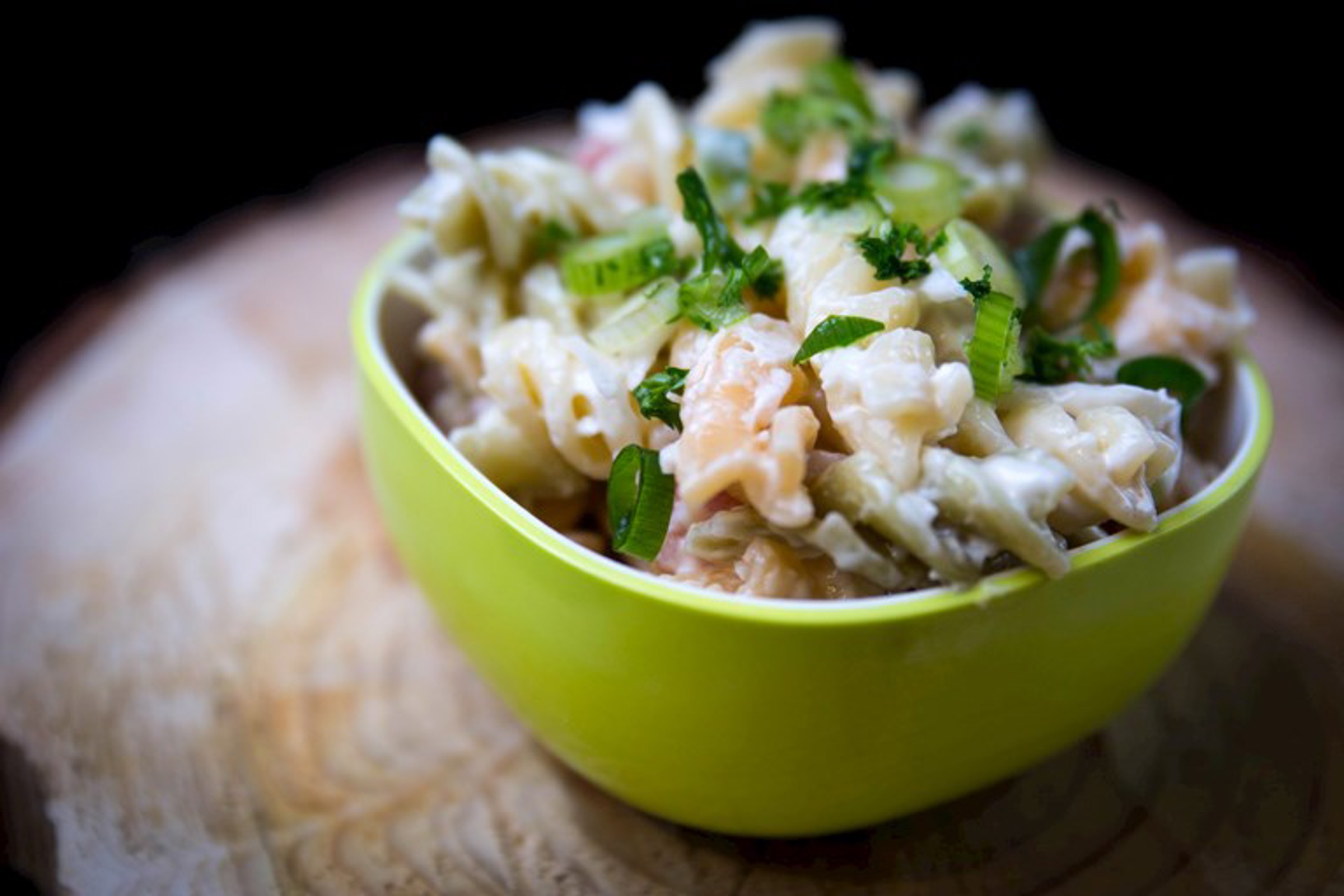 Huisbereide pastasla op basis van tomaatjes, maïs, pijpajuintjes in een zachte honingmosterdvinaigrette.