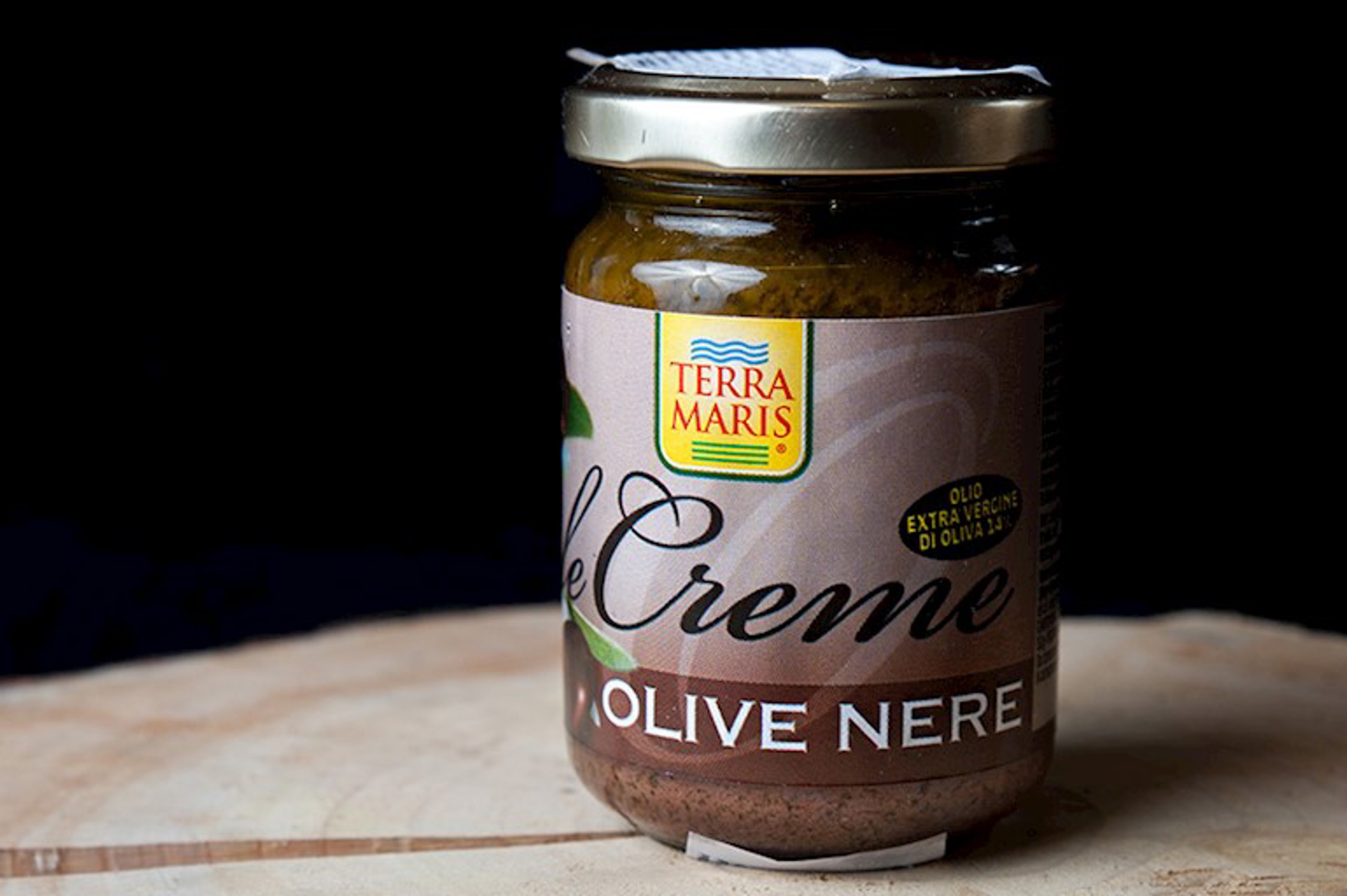 Crema Olive Nere. Een crema (tapenade) van zwarte olijven, geschikt voor pasta, op een bruschette of te gebruiken als dipper.