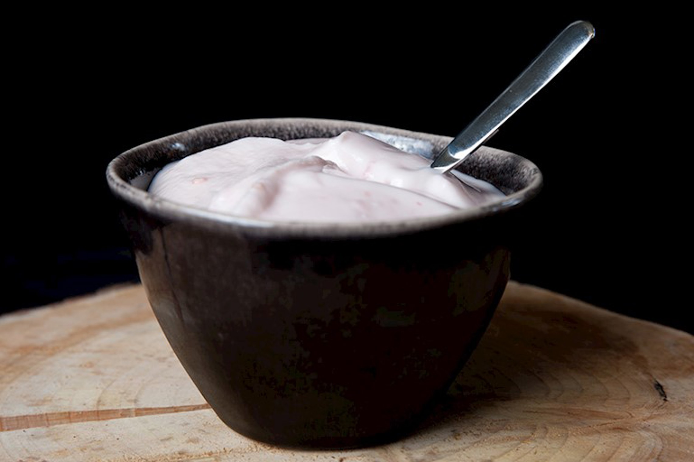Magere verse kaas met aardbeien. De kaas heeft een dik vloeibare structuur, rozig van kleur met een frisse, licht zure geur en smaak.