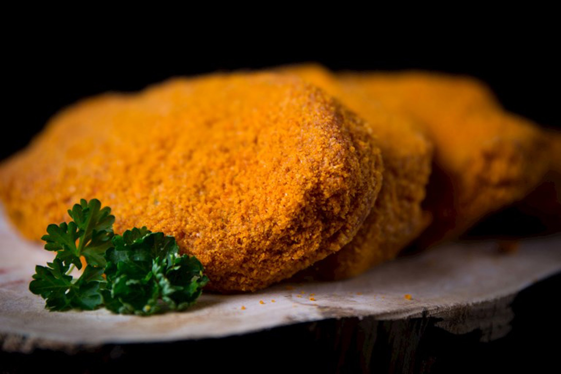 Een mager, mals lapje varkensvlees omwikkeld in een jasje van gekruid paprikapaneermeel.