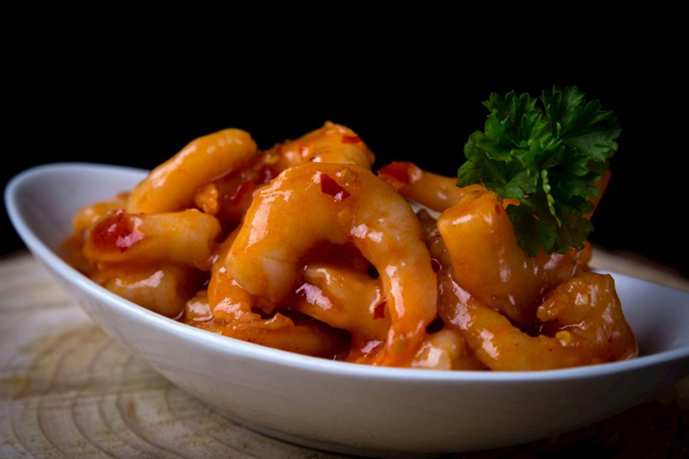 Heerlijke, krokante reuzenscampi's in een zoetzure, licht pittige marinade met stukjes waterkastanje.