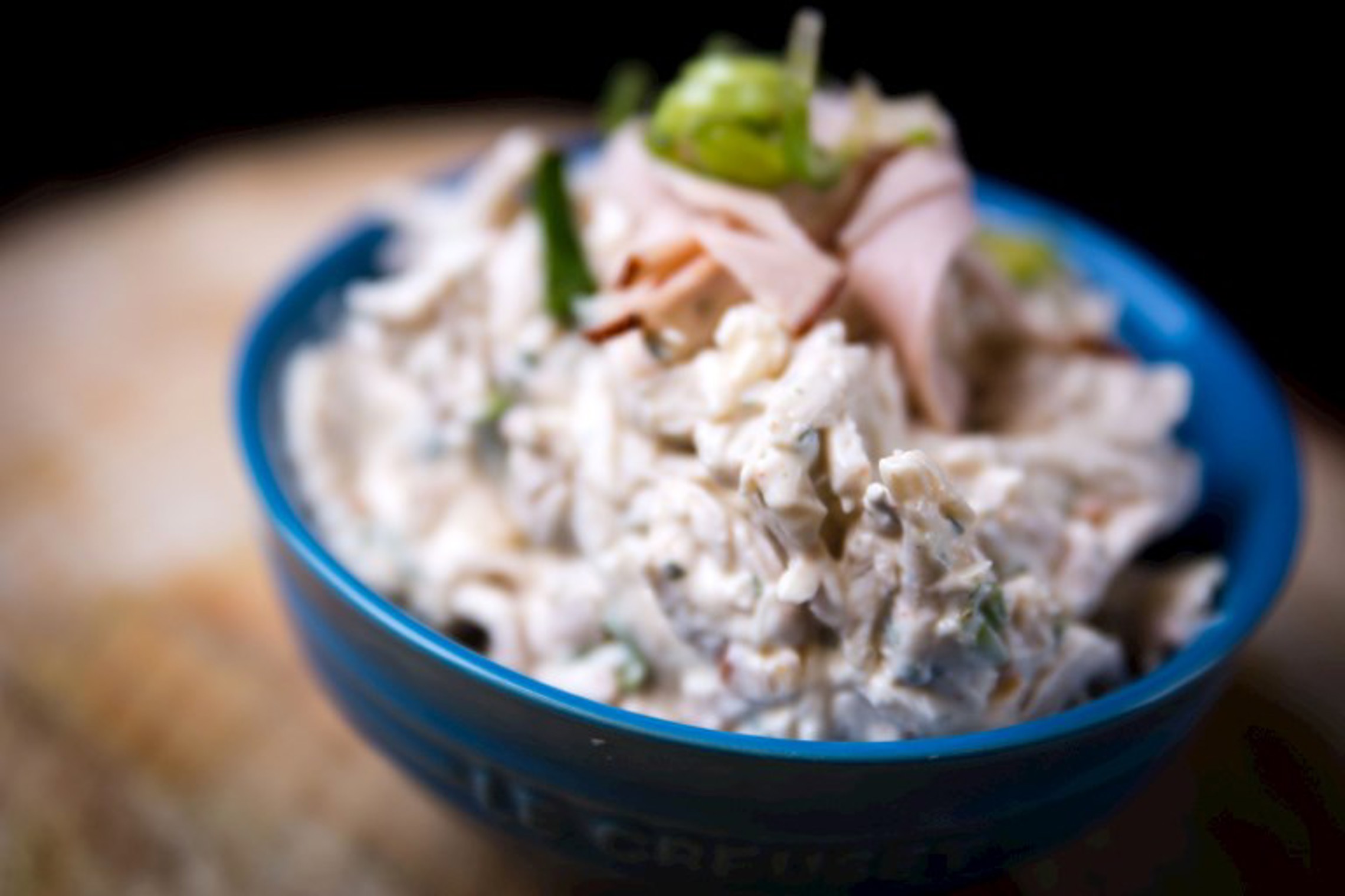 Fijne gekruide en gebakken reepjes varkensgebraad met ajuinblokjes in een tartaarsausje.