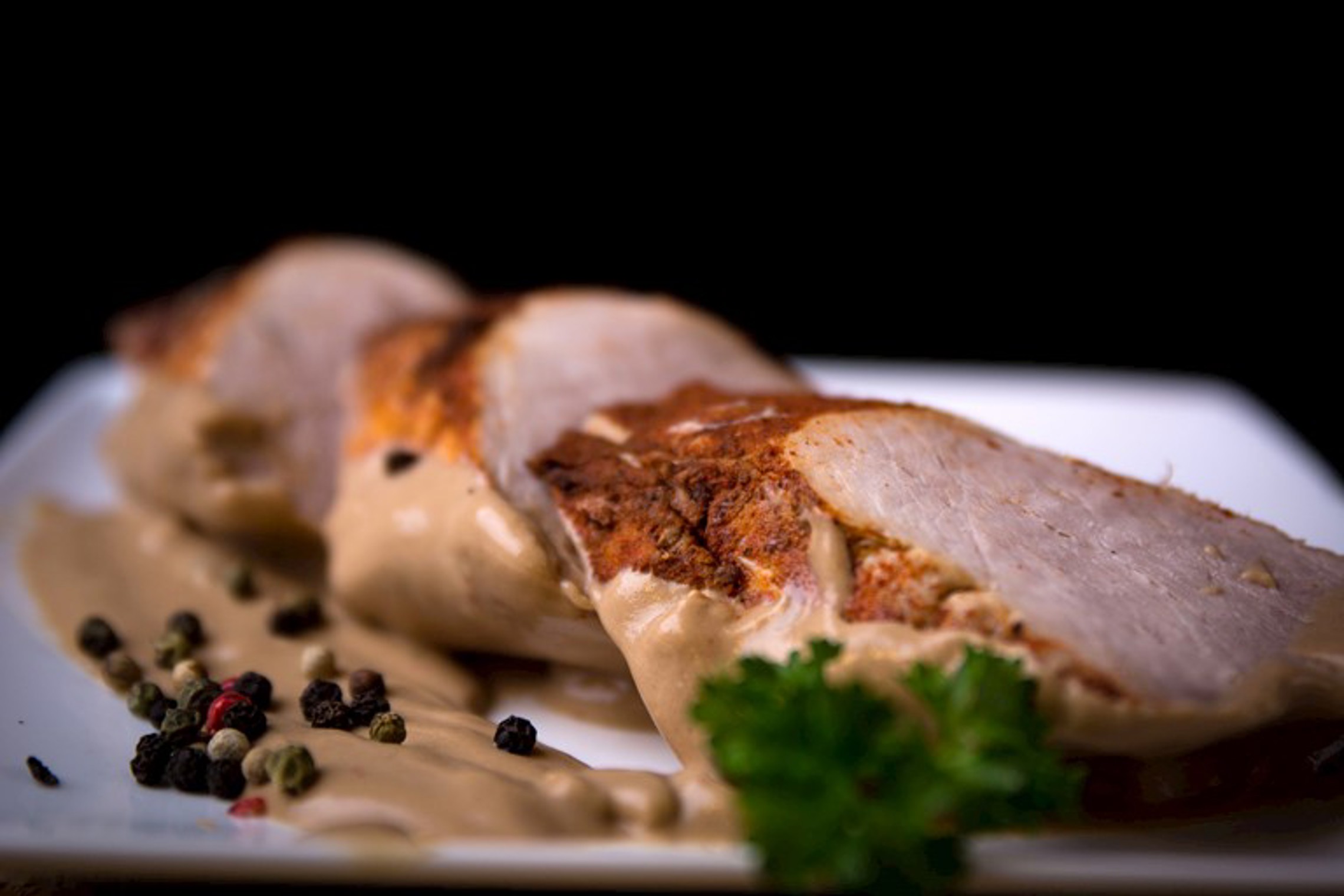 Sappig varkenshaasje, versneden in stevige nootjes, overgoten met een smaakvolle champignonsaus.