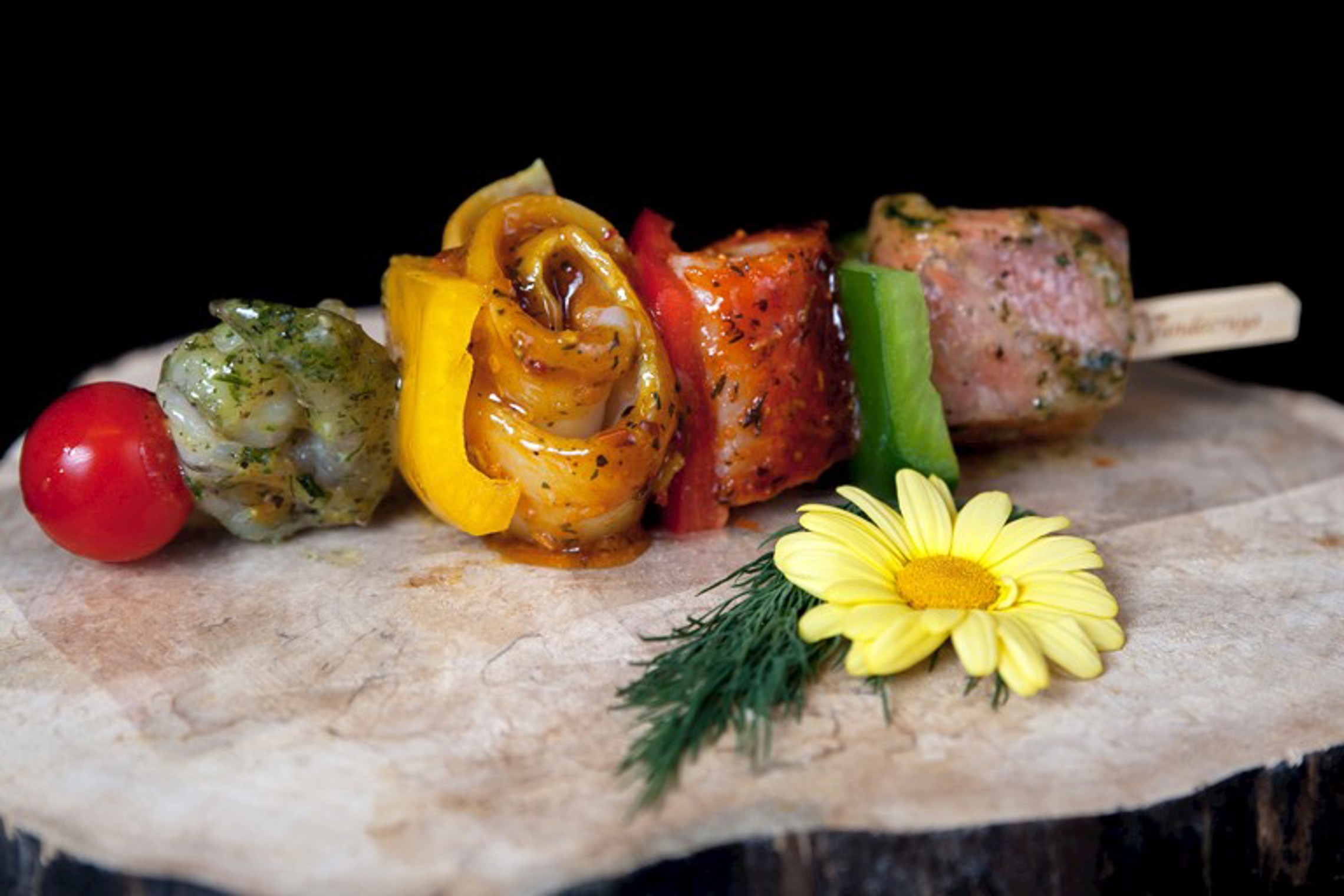 Heerlijke brochette van tongrolletjes, zwaardvis, scampi en zalm. Afgewerkt met een heerlijke vismarinade, gele en groene paprika's en een kerstomaatje.